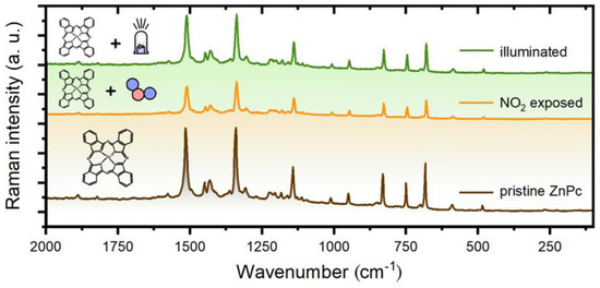 SERS spectra of a ZnPc layer in 3 various states (pristine, after NO2 exposure, and after illumination).