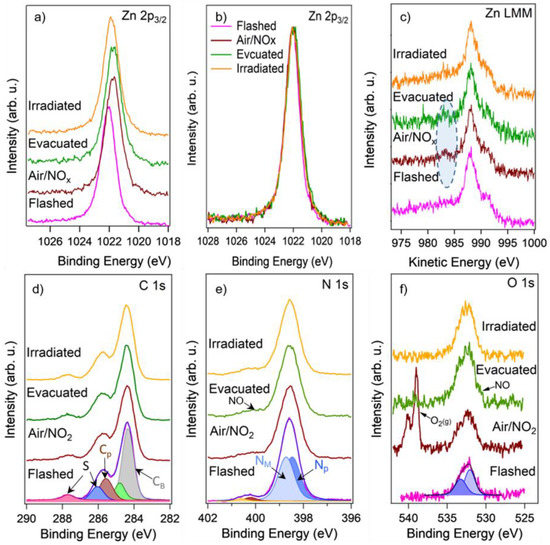 Figure 8a demonstrates a comparison of the Zn 2p3/2 XPS spectra acquired on the ZnPc layer: right after the flash, during exposure to air/NO2, after the evacuation, and after the illumination by laser. The Zn 2p3/2 spectrum measured in UHV on the flashed layer revealed Zn atoms in Zn2+ oxidation state (~1022 eV). Exposure of the sample to 1 mbar of the air/NO2 led to attenuation of the peak intensity due to the signal absorption by the gas, and at the same time to its shift to lower binding energies (BE) by 0.3 eV that results most likely from band bending caused by adsorption of NO2 on the ZnPc surface, similarly as it is seen in case of metal oxides [29,34]. Another explanation might be that the peak shift to lower BE is connected with the Zn reduction. However, it is hardly expectable during NO2 exposure. Moreover, completely the same shift in the same direction was seen in all spectra (i.e., Zn LMM, C 1s, N 1s, and O 1s) measured together with the Zn 2p3/2 spectrum during NO2 exposure, confirming the band bending effect and excluding the reduction of phthalocyanine. This shift persisted even after the sample evacuation, indicating the persistence of the adsorbate species even after removal of the gas. Only the illumination of the sensor by laser partially restored the peak position by shifting it back by 0.15 eV. For easier comparison, the Zn 2p3/2 spectra, as well as other presented spectra, were processed according to a procedure that included spectra normalization to the same height and elimination of the band bending effects by shifting them to a higher BE (0.3 eV for the spectra measured in air/NO2 atmosphere and after the evacuation, and by 0.15 eV for the spectrum measured after the illumination by laser). The processed Zn 2p3/2 spectra are shown in Figure 8b. It can be seen that they look quite similar except for a slight broadening that appeared after the exposure to NO2, which might be related to the interaction of the Zn atoms with the NO2 molecules. The interaction of the Zn ions with NO2 can be better observed from the corresponding Zn LMM Auger spectra displayed in Figure 8c. It is known that the X-ray-induced Zn LMM Auger spectrum usually shows a much more significant shift with a change in the chemical state [35]. Indeed, it can be seen that before the air/NO2 exposure, the Zn LMM spectrum of the ZnPc layer consists of several features with the main peak at KE = 988 eV (KE–photoelectron kinetic energy), while after the exposure, a small peak appeared at about 984 eV. We could not find a reference for the Zn LMM peak at 984 eV in the literature, but this peak is probably related to those Zn2+ ions in ZnPc that adsorbed NO2 molecules. To explain this, we need to compare the Auger peaks for different Zn binding states corresponding to metallic Zn, ZnO, and ZnSO4. They appear to be at 992 eV, 988 eV, and 986 eV, respectively [36,37], and following this trend, it is reasonable to suggest that the adsorption of NO2 on ZnPc and subsequent formation of Zn-NO2 (or Zn-NO) compounds may result in the Zn LMM Auger peak at 984 eV.