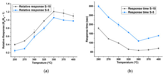 (a) Temperature vs. relative response of S-10 and S-5 NiO at 10% r.h. (b) Temperature vs. response time of S-10 and S-5 NiO at 10% r.h.