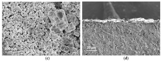 SEM cross-section images in Figure 5b,d suggest that the film thicknesses are around 5 µm and 10 µm for S-5 and S-10 NiO sensors, respectively. The SEM images in Figure 5a,c show that the S-10 NiO film has macro-pores, whilst the S-5 NiO film is more compacted. Here, the grains agglomerated into small nanoclusters interconnected through their grain boundaries. In the S-10 sensor, a more open microstructure was observed, which results in a higher surface-to-volume ratio, leading to a higher number of active sites for the solid–gas interaction. Furthermore, the presence of macro-pores in the S-10 sensor allows the target gases to further penetrate through the thickness of the film to interact with the inner grains of the sensing element.