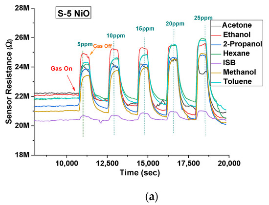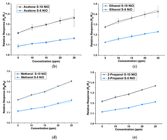 Both types of sensors were tested on acetone, ethanol, 2-propanol, hexane, isobutylene, methanol, and toluene between 5 ppm and 25 ppm in 5 ppm steps at 40% r.h. condition (using the water bubbler). NiO showed a larger response to ethanol, acetone, methanol, and 2-propanol vapours. Thus, the response was higher for hydroxyl (-OH) and carbonyl functional groups over other groups for the given concentrations. The gas-sensing mechanism could be explained through band bending. When the target gas is introduced, the VOC gas molecules interact with the pre-adsorbed oxygen ions present on the surface and release free electrons. The released electrons neutralize the excess holes present in the p-type material (NiO in this case) due to charge carrier recombination, which leads to band bending [27]. Figure 6a illustrates the stable response of the S-5 sensor towards all the 7 VOCs at concentrations between 5 ppm and 25 ppm at 350 °C and 40% r.h. NiO, being a p-type semiconductor material, showed an increase in resistance when subjected to all the VOCs (which in our case are all reducing gases). Similar behaviour was also found for the S-10 sensor, but data are not shown here. Figure 6b–e shows a comparison of concentrations versus relative response of both sensors to four target VOCs. The dotted line represents a linear fit, with standard deviation added for repeated testing.