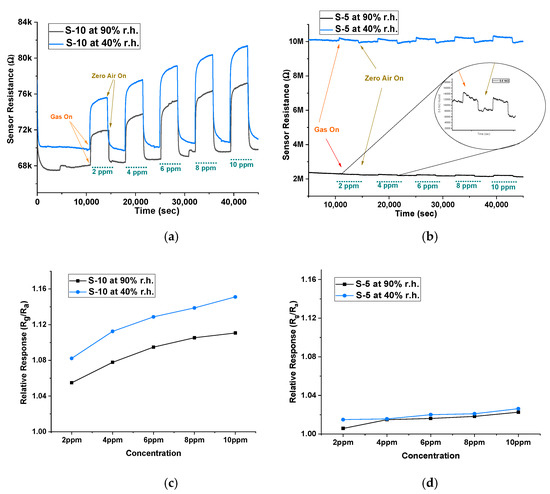 Baseline resistance and sensor response at 40% r.h. and at 90% r.h. conditions of (a) S-10 sensor and (b) S-5 sensor. Relative response (Rg/Ra) at 40% r.h. and at 90% r.h. conditions of (c) S-10 sensor and (d) S-5 sensor.