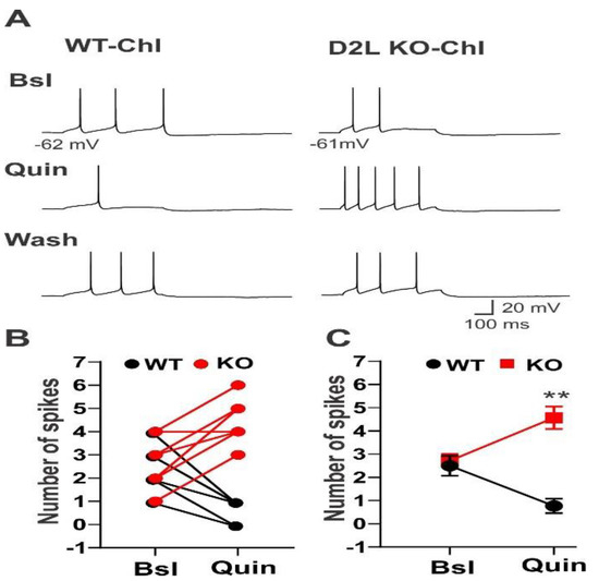 Quinpirole increased the excitability of ChIs in D2L KO mice. (A) Baseline (Bsl) spikes were induced by injecting depolarizing currents in ChIs from WT and D2L KO mice (top traces). Quinpirole (Quin) significantly decreased the firing rate in ChIs from WT mice (left middle trace), but significantly increased the firing rate in ChIs from D2L KO mice (right middle trace). Wash: spikes were recorded after washing off quin (bottom traces). (B) Summary of quinpirole effects on spike firing of ChIs from WT mice (filled black circles, n = 6) and from D2L KO mice (filled red circles, n = 7). The spike numbers of individual cells were plotted versus Bsl (without quin) or in the presence of Quin. (C) The mean spike numbers of cells were plotted versus Bsl or Quin. ** p < 0.003 (WT); ** p < 0.006 (D2L KO; Student’s t-test). Note that some lines are overlapped in Figure 1B, Figure 2B and Figure 3B.