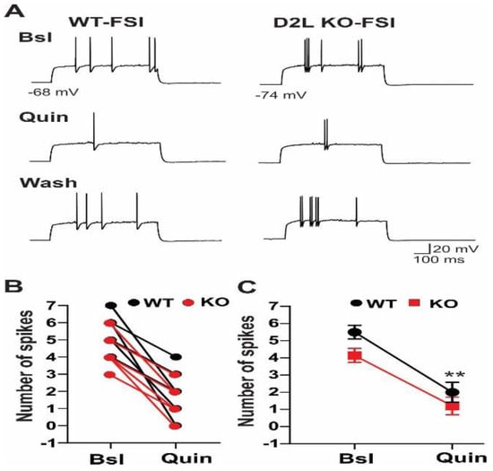 Furthermore, quinpirole suppressed the spike firing in FSIs in both WT and D2L KO mice (WT: Bsl: 5.52 ± 0.42 Hz, Quin: 2.00 ± 0.57 Hz, n = 6; p < 0.001; D2L KO: Bsl: 4.14 ± 0.40 Hz, Quin: 1.14 ± 0.41 Hz, n = 8; p < 0.001) (Figure 3A–C). There was no significant difference in quinpirole-produced suppression of firing rate between WT FSIs and KO FSIs.