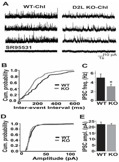 3.2. D2L Deficiency Resulted in a Decrease in mIPSC Frequency in Cholinergic Interneurons