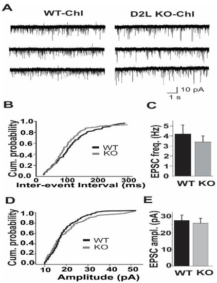 The frequency and amplitude of mEPSCs in ChIs were similar in WT and D2L KO mice. (A) Representative current traces recorded from ChIs of WT and D2L KO mice. Cumulative probability plot (B) and summarized bar graph (C) reveal there is no significant difference in mEPSC frequency between WT (n = 6) and D2L KO mice (n = 5) (p > 0.08). Cumulative probability plot (D) and summarized bar graph (E) reveal there is no significant difference in mEPSC amplitude between WT and D2L KO mice (p > 0.9). WT (Black lines or bars) and D2L KO (Grey lines or bars).