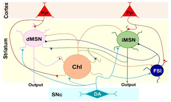 MSNs, ChIs, and FSIs together account for approximately 98% of neurons in the striatum. All three types of neurons can reciprocally modulate each other’s activity via local synaptic connections and are key modules in the striatal microcircuit [17,41] (Figure 7). dMSNs and iMSNs can also influence each other’s activity through local axon collaterals [9]. All three types of striatal neurons receive excitatory glutamatergic inputs from the cortex and dopaminergic inputs from the substantia nigra compacta (SNc) [8]. The increased intrinsic excitability of ChIs showed in the present study would likely lead to an increase in the release of acetylcholine (ACh), which in turn activates muscarinic and nicotinic receptors located on various cells, glutamatergic afferents, or dopaminergic afferents in the striatum [42,43,44]. Consequently, this would cause a disruption in neural network dynamics within the striatum as well as an imbalance between dMSN- and iMSN- mediated outputs.