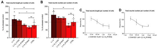 Effect of CRASH-derived peptides on proliferating SH-SY5Y cells. (A) Total neurite length per number of cells, (B) neurites per number of cells. Treatment with mutant peptides hampers neurite elongation, whereas has a limited effect on sprouting. (C) Total neurite length per number of cells treated with 10pM L1CAM ED and increasing concentration of L1-A_R184Q (from 10nM to 10 µM). (D) Total neurite length per number of cells treated with 1pM L1CAM ED and increasing concentration of L1-A_R184Q (from 10 nM to 10 µM). All data represent the mean ± SD of at least three independent experiments. Significance at p ≥ 0.05 (ns), p < 0.05 (*), p < 0.001 (**), between treated samples and untreated control is reported.