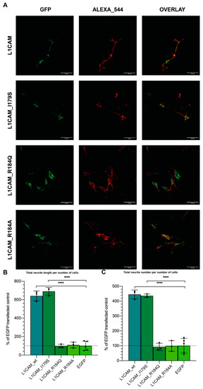 Neuritogenesis of proliferating SH-SY5Y cells transfected with L1CAM derived CDS. (A) Confocal images of GFP-tagged wt or mutant L1CAM-transfected cells. Treatment with secondary antibody was performed on nonpermeabilized cells. (B) Total neurite length per number of cells, (C) neurites per number of cells of proliferating SH-SY5Y cells transfected with indicated constructs. Neuritogenic potential is completely lost in transfection with L1CAM_R184A and L1CAM_R184Q, however is retained by L1CAM_I179S. Significance at p < 0.0001 (****) between samples and untreated control is reported.