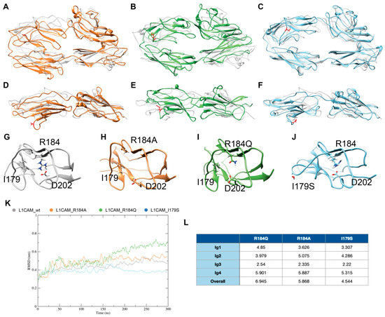 Molecular dynamics simulations of L1CAM and its mutants. Comparison of models after 300 ns simulations with wt (A–C) side view, (D–F) top view (orange: L1CAM_R184A, green: L1CAM_R184Q, light blue: L1CAM_I179S, white: L1CAM wild type). (G–J) Structural variation of Ig2 domains of WT, R184A, R184Q, and I179S mutants, respectively. (K) Variation of the root mean square deviation (RMSD) of the Ig2 domain during the simulation. (L) All-atom RMSD between mutants and wild type final structures. All data are reported in Å.