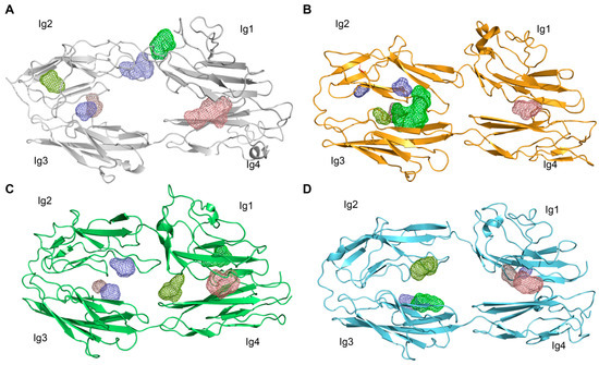 To gain further insight about the possible peptide binding site on the L1 horseshoe structure, final models from MD simulations were then submitted to PeptiMap. As shown in Figure 5, all possible peptide binding sites were predicted on the inner side of the horseshoe, at either the Ig2–Ig3 or the Ig1–Ig4 interface; notably, such predicted binding pockets are retained by all mutants and, particularly, by the CRASH-causing mutant R184Q.