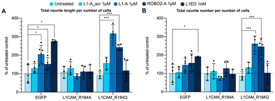 To suggest NOG-derived peptides as a possible therapy for forms of CRASH syndrome caused by mutations in the Ig2 domain, we used the previously described cell model. Particularly, cells transfected with L1CAM_R184Q (causing the most severe CRASH phenotype) were treated with either 1µM L1-A, 1nM L1CAM ED, 1 µM L1-A_scr [21], or left untreated, and compared with controls, i.e., EGFP-transfected cells. L1CAM_R184A was also included in the analysis as it is predicted to assume an even worse conformation than the naturally occurring mutation R184Q. As expected, EGFP transfection did not alter L1-A or L1CAM ED-mediated neuritogenesis (Figure 6). Coherently with in silico predictions, (i) the nonnatural mutation R184A could not be rescued by treatment with either L1CAM ED or L1-A, (ii) L1CAM ED was also ineffective with L1CAM_R184Q, while (iii) strikingly, L1-A and ROBO2-A could rescue such natural and severe mutation of L1CAM, strengthening the suggested therapeutic prospective.