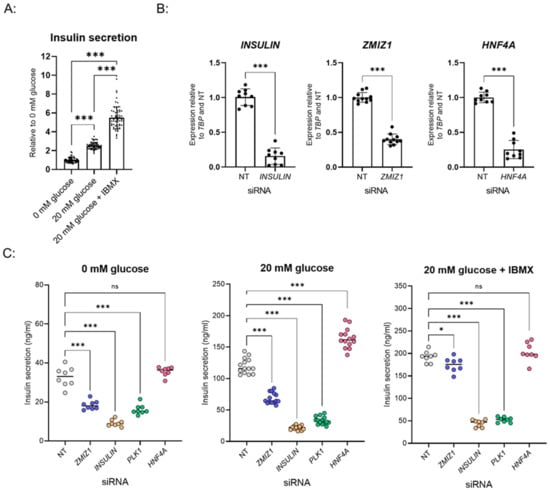 To identify positive and negative controls for the screen, we assessed the effects of siRNA targeting genes expected to alter insulin secretion [13]. Knockdown of INSULIN or PLK1 resulted in a significant decrease in insulin secretion across all conditions (0 mM glucose, 20 mM glucose, 20 mM glucose + IBMX) (Figure 1C). In line with previous studies, knockdown of ZMIZ1 diminished insulin secretion, particularly in the 0 mM glucose and 20 mM glucose conditions (Figure 1C) [13,15]. Conversely, knockdown of HNF4A significantly increased insulin secretion in the high glucose condition (Figure 1C). Collectively, we verified siRNAs targeting INSULIN, PLK1, and ZMIZ1 as negative controls and HNF4A as a positive control for inclusion in the screen.