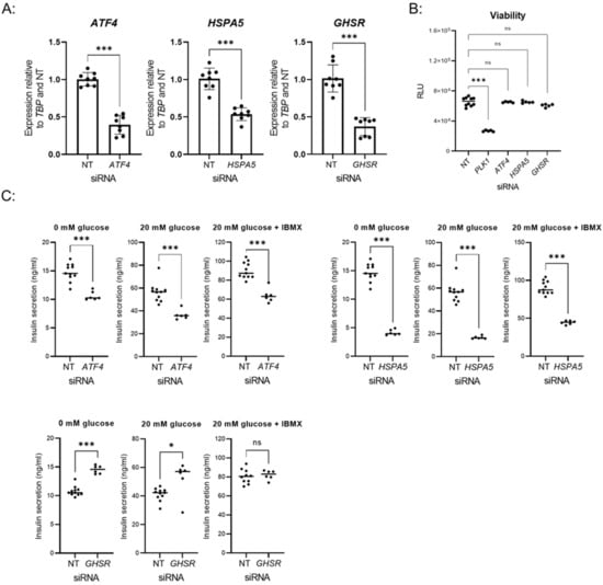 Independent validation of selected hits. (A) Relative expression of ATF4, HSPA5, and GHSR after knockdown with respective siRNAs in 384-well format. Data points show the mean ± SD of independent wells (n = 8) from two experiments. *** p-value < 0.001, t-test. (B) Viability of cells after knockdown. Data points showing relative light unit (RLU) are the mean ± SD of independent wells (n ≥ 5) from one experiment. ns p value > 0.05, *** p-value < 0.001, one-way ANOVA. (C) GSIS assay performed after transfection with following siRNAs: non-targeting (NT) control, ATF4, HSPA5, GHSR. Mean ± SD of n = 11 for siRNA NT and n = 6 siRNA ATF4, HSPA5, GHSR of independent wells from one experiment. ns p value > 0.05, * p-value < 0.05, *** p-value < 0.001, t-test.