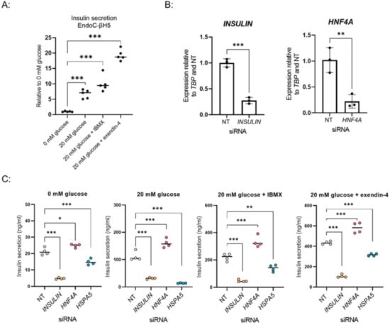 EndoC-βH5 cells (Human Cell Design) were thawed and cultured following the manufacturer’s protocol. Cells were seeded 20,000 cells/well into 384-well plates (Perkin Elmer CellCarrier-384 Ultra, 6057300, Seer Green, UK). Reverse transfection was performed as described in Section 2.6. Media was refreshed 4 days post-seeding, GSIS was performed on day 7 as described in Section 2.4.