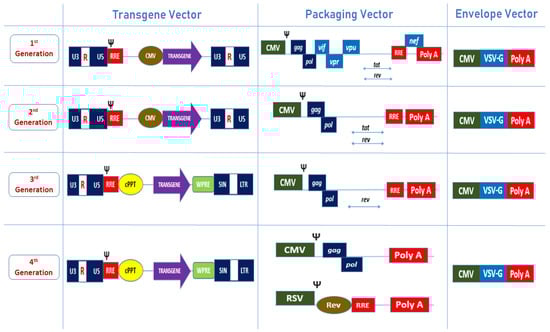- Wu, X.; Wakefield, J.K.; Liu, H.; Xiao, H.; Kralovics, R.; Prchal, J.T.; Kappes, J.C. Development of a Novel Trans-Lentiviral Vector That Affords Predictable Safety. Mol. Ther. 2000, 2, 47–55. [Google Scholar] [CrossRef] [PubMed]