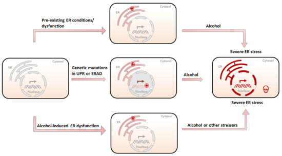 Possible etiology of alcohol-related pancreatitis. (1) A pre-existing ER condition resulting from stressors other than alcohol (tobacco, high-fat diet, etc.) is further exacerbated by alcohol exposure, causing irreversible damage to the ER and subsequent cell death. (2) Genetic mutations in UPR or ERAD compromise the ability of the ER to deal with unfolded/misfolded proteins, and therefore sensitize the ER to alcohol-induced damages, leading to severe ER stress and pancreatic damages. (3) Pre-exposure to alcohol compromises the ability of the ER to maintain homeostasis and makes the ER susceptible to subsequent alcohol exposure or other ER stressors, resulting in severe pancreatic damages.