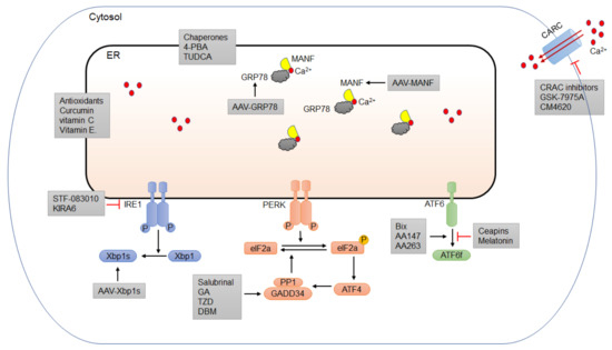 Gene therapy using recombinant viruses is becoming an attractive strategy to deliver active UPR components to specific tissues. This method avoids the pleiotropic effects of systemic and chronic administration of ER-stress-targeting compounds. Adeno-associated viruses (AAVs) are the current choice to deliver therapeutic genes because of their safety profile demonstrated in pilot clinical trials [268]. GRP78 is an important ER chaperone as it participates in the regulation of all three arms of UPR signaling [269]. Enhanced GRP78 expression can alleviate ER stress in experimental models for a variety of disorders [270]. For example, AAV-mediated gene transfer of GRP78 ameliorated retinal cellular injury by mitigating ER stress in mice [271], rats [272] and human retinal epithelium cells [273]. In a rat model of Parkinson’s disease, overexpression of GRP78 by recombinant AAV attenuated ER stress, promoted the survival of nigral dopamine (DA) neurons, and restored behavioral deficits [274]. Over-production of GRP78 driven by a rat insulin promoter in pancreatic beta cells provided protection against high-fat-induced ER stress and diabetes in mice [275]. In a caerulein-induced AP model, Grp78+/− mice displayed greater pathological alterations, including morphological change, cell necrosis, edema, and inflammation, when compared with wild-type mice, suggesting a protective role of GRP78 in AP [276]. Therefore, one may take GRP78 into consideration as a potential therapeutic target in alcoholic pancreatitis, while AAV-mediated delivery of GRP78 may be readily tested in experimental models.