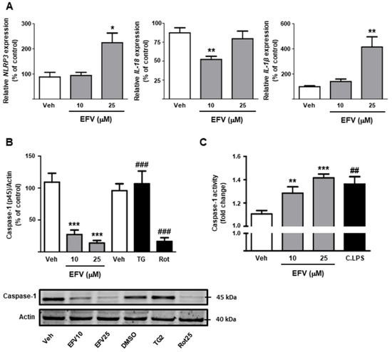 EFV significantly enhanced the transcription of NLRP3 and that of the effector cytokine IL-1β, whereas expression of IL-18 actually decreased (10 µM) (Figure 2A). Activation of the NLRP3 inflammasome was confirmed by a profound reduction in the protein expression of procaspase-1 in EFV-treated cells. Importantly, the inducer of mitochondrial dysfunction rotenone generated a similar decrease that was not reproduced by the classic ER stress-inducer thapsigargin (Figure 2B). Colorimetric assessment of the activity of Caspase-1 following EFV treatment revealed a significant and concentration-dependent increase that reached levels comparable to those induced by a cocktail of LPS (C.LPS) (Figure 2C).