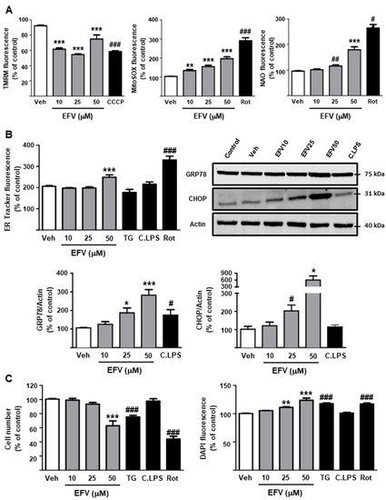 EFV induced mitochondrial dysfunction in a concentration-dependent fashion, decreasing ΔΨm (TMRM fluorescence) and enhancing the production of ROS (MitoSOX fluorescence). EFV-treated cells also exhibited increased NAO fluorescence, an indicator of mitochondrial mass alteration, but only at the highest concentration (50 µM) (Figure 3A). However, the protein expression of two important mediators of the unfolded protein response and ER stress, GRP78 and CHOP, was significantly and concentration-dependently augmented. Nevertheless, an increase in ER Tracker Red fluorescence suggestive of alterations in ER appearance was observed only in cells treated with 50 µM EFV (Figure 3B). Following treatment, a cell count to define how these alterations affected the proliferation/survival of this line of HSCs revealed a significant reduction at the highest concentration (50 µM). However, a concentration-dependent increase in Hoechst 33342 fluorescence was also observed, pointing to changes in nuclear size or morphology that are commonly associated with nuclear condensation in response to cellular stress (Figure 3C).