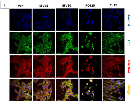 Autophagy is thought to drive HSC activation by providing essential energy substrates through hydrolysis of lipid droplets. Evaluation of intracellular lipid content revealed a differential response among EFV concentrations, with 10 and 25 µM diminishing the intensity of the Nile Red signal and 50 µM inducing a slight increase in this parameter (Figure 4A). Importantly, incubation with the autophagic inhibitor 3MA reversed this decrease in 25 µM EFV-treated cells, implicating autophagy in the effect of this NNRTI (data not shown). Analysis of Lysotracker Green fluorescence, an indicator of autophagic flux, showed a significant increase in intensity only with 50 µM (Figure 4B). Moreover, EFV induced changes in the expression of the autophagy-related protein LC3-II, also suggesting an induction of autophagy (Figure 4C). To ascertain if EFV was activating lipophagy in HSCs, we analyzed the correlation index between LC3 and Nile Red signal using confocal fluorescence microscopy. As shown in the representative images and in the analysis of the correlation index (Figure 4D), EFV altered the fluorescence of both signals, increasing Nile Red staining and favoring the accumulation of LC3-II-characteristic punctae, especially at high concentrations. It also induced a significant and concentration-dependent overlapping of green (LC3) and red signals (Nile Red), thereby pointing to the induction of an autophagic degradation of lipid droplets. Rotenone exerted similar effects to 50 µM EFV, whereas C.LPS altered neither the individual levels of LC3 or Nile Red nor the co-localization of their signals.