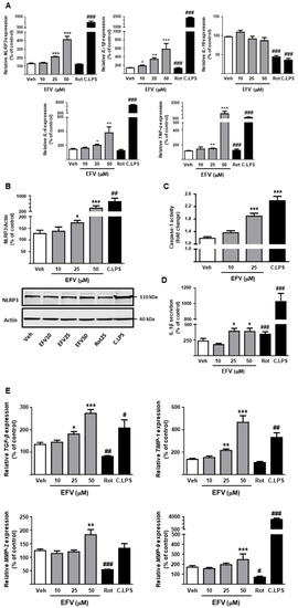 After determining the deleterious effects of this NNRTI on cellular function, we assessed whether these actions could lead to NLRP3 inflammasome activation and production of cytokines in HSCs. EFV concentration-dependently upregulated NLRP3 expression in this cell line and induced overexpression of the pro-inflammatory cytokines IL-1β, IL-6 and TNF-α (Figure 5A); as in Hep3B cells, no changes were observed in IL-18 levels. The pro-inflammatory profile suggested by the RT-PCR results was confirmed by an array in which EFV enhanced the expression of these and other genes implicated in inflammation and cellular stress, such as CASP1, IL-33, PYCARD and PANX1 (Supplementary Figure S1). As expected, WB of whole-cell protein extracts of EFV-treated cells revealed a significantly increased expression of NLRP3 (Figure 5B). Additional experimental approaches corroborated the activation of the NLRP3 inflammasome pathway, as LX2 cells incubated with 25 or 50 µM EFV displayed increased activity of Casp1 and enhanced secretion of IL-1β (Figure 5C,D). EFV-induced changes in NLRP3 inflammasome activation and inflammation were similar globally, but less severe than those elicited by C.LPS. Interestingly, and despite having shown similar effects to EFV in hepatocytes, rotenone did not affect these inflammatory parameters in HSCs.