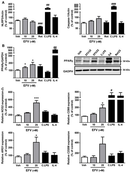 Efavirenz induces anti-inflammatory pathways in macrophages. (A) Determination of protein expression of NLRP3 and Caspase-1 (n = 8–10). (B) Representative Western Blot image of PPARγ and summary of densitometry data obtained from independent experiments after 24 h treatment (n = 5). (C) Analysis of relative mRNA expression levels of M1 (NOS2 and CD86) and M2 markers (ARG1 and CD206) by RT-PCR. Data were normalized versus the housekeeping gene β-actin (n = 5–6). Data were represented as mean ± SEM, were calculated as a percentage of control (untreated cells) and analyzed by a one-way ANOVA multiple comparison test followed by a Newman–Keuls test (* p < 0.05, *** p < 0.001 versus the respective solvent). Positive controls employed (rotenone -Rot-, cocktail of LPS -C.LPS- and interleukin 4 -IL-4-,) were independently analyzed by a Student’s t-test (# p < 0.05, ## p < 0.01, ### p < 0.001).