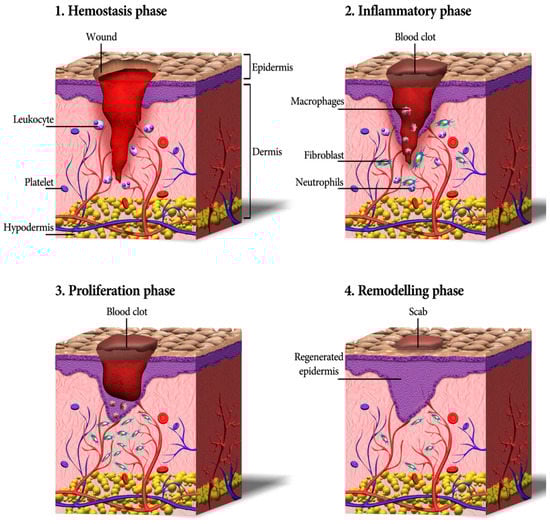 Cutaneous wound healing consists of a sequence of molecular and cellular events which occur after the onset of a tissue lesion in order to restore the damaged tissue. This process can be subdivided into four phases namely hemostasis, inflammation, proliferation, and remodeling (Figure 1) [17,31].