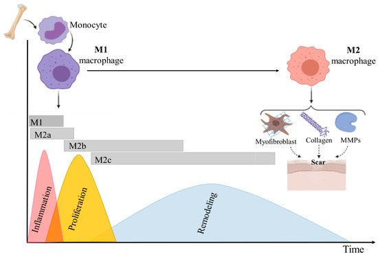According to some reports, macrophages phenotype (subpopulation) depends mostly on the time of monocytes recruitment [56]. Other studies suggested that monocytes phenotypes are determined by stimuli in the wound healing environment. These stimuli change cell polarization and result in the differentiation of M1 macrophages into M2 macrophages (Figure 2) [67].