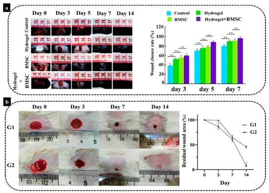 (a) Wound healing conditions of mice in the control group, the hydrogel group, the BMSCs group and the hydrogel–BMSCs combination group, 3, 5, 7, and 14 days after the operation with comparison of the wound healing rates of mice (** p < 0.01). (b) The comparison of wound area in two different groups (G1: without treatment and G2: treated with BMSCs plus the biomaterial, * p < 0.05) and the graph of residual wound site [136,137].