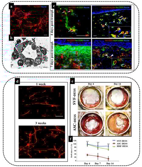 In this respect, we confirmed vasculogenic properties of the SVF by phenotypic and functional characterization of the freshly isolated CD31+/CD34+ ECs and CD31+CD34- ASCs [8,11,158]. These two cell populations present in the SVF developed spontaneously into mature, highly branched, and interconnected vascular networks when cultured in a 3D scaffold [8]. In a particular study, we explored the use of human endothelial cells derived from freshly isolated adipose stromal vascular fraction (SVF) in a 3D coculture model of vascularized skin substitute in full-thickness wounds in immune-deficient rats [8]. Results demonstrated the rapid graft–host vessel anastomoses and blood perfusion (Figure 5a–c). Moreover, we successfully applied freshly isolated SVF cells to generate a prevascularized human dermo-epidermal skin substitute (DESS) based on a 3D hydrogel coculture system [4]. As demonstrated in our studies, these capillary networks showed a rapid inosculation in an animal model and thus improved the wound healing process of the skin substitutes [4]. In particular, we employed fibrin hydrogels as a 3D matrix and an optimal number of SVF cells were seeded in the hydrogel to generate a functional and homogeneous dermal capillary plexus prior to transplantation (Figure 5d). Fibrin is the physiological matrix present at the onset of wound healing and acts as an important adhesion site for leukocytes and endothelial cells during tissue regeneration. Moreover, the stiffness, biodegradability, and pore size of fibrin hydrogels might strongly influence and direct the lineage-specific cell differentiation and secretome of loaded stem cells [159,160,161]. Thus, fibrin hydrogels can provide an appropriate matrix to encapsulate SVF to prepare a DESS. The in vivo analysis after implantation of SVF based DESS (Figure 5e) showed the graft size of the SVF-treated group was significantly increased at day 4, day 7, and day 14, as compared to the ASC only-based transplants.