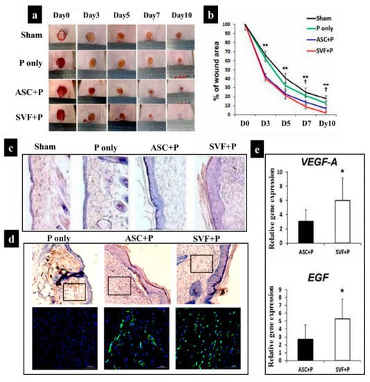 Additionally, some other studies have demonstrated the application of SVF-loaded scaffolds for wound healing. For example, in the study of Chae et al. [162], a pluronic hydrogel was employed to deliver human ASCs and SVF into the wound site via injection. The comparison of four different categories including sham, pluronic hydrogel only (P), pluronic hydrogel with ASCs (ASC+P), and a pluronic hydrogel with SVF (SVF+P) in vivo demonstrated that SVF+P injection into the dermis triggered the strongest wound contraction, improved cellularity, and re-epithelialization process in comparison with sham, P, and ASC+P (Figure 6). This effect was mainly due to the high vasculogenic potential of SVF and high secretion of vascular endothelial growth factor (VEGF-A) and epidermal growth factor (EGF) (Figure 6). Notably, EGF plays an essential role in epithelialization by promoting the migration and proliferation of keratinocytes and fibroblasts via the phosphoinositide 3–kinase signal and extracellular signal-regulated kinase pathways [163,164,165].