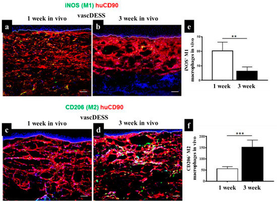 Infiltration of distinct subsets of macrophages into vascDESS in vivo. (a,b) Infiltration of iNOS M1 macrophages into vascDESS in vivo. Double-label immunofluorescence for iNOS macrophages (green) and human CD90 (red) in vascDESS at 1 and 3 weeks of post-transplantation. (c,d) Expression of CD206 in transplanted vascDESS in vivo. M2 macrophages were detected with an antibody against CD206 (green) within the human CD90-stained neodermis (red). CD206 macrophage (M2) density was increased in vascDESS after 3 weeks as compared to 1 week in vivo. (e,f) The quantification of iNOS and CD206 density in transplanted skin analogs at 1 and 3 weeks in vivo (** p < 0.01,*** p < 0.001) [158].