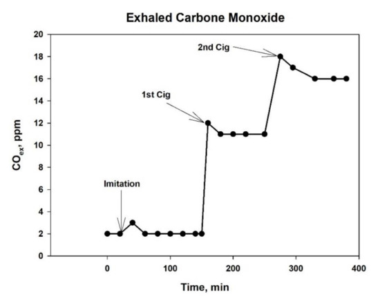 To study the effect of smoke on the ANS, we took advantage of Nirdosh tobacco-free cigarettes, which have long been used in Oriental meditation practice and are manufactured on an herbal basis with a cellulose acetate filter. With the help of such cigarettes, it is relatively safe to study the effect of smoke on the bodies of non-smokers under conditions as close as possible to smoking a regular cigarette, including all the attributes inherent in smoking. The tar yield in the smoke of such cigarettes reaches 22 mg without the use of special tar capacitors in the form of filter mouthpieces and less than 6 mg with the use of such devices, which is more consistent with the tar delivery in modern cigarettes of a moderate strength. The preliminary tests showed that removing a significant portion of the tar from cigarette smoke did not affect the CO concentration in the smoke. The typical profile of the CO dynamics in the exhalation of a volunteer after smoking two cigarettes is exemplary shown in Figure 1.