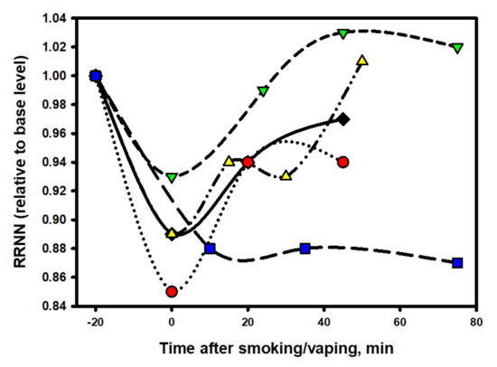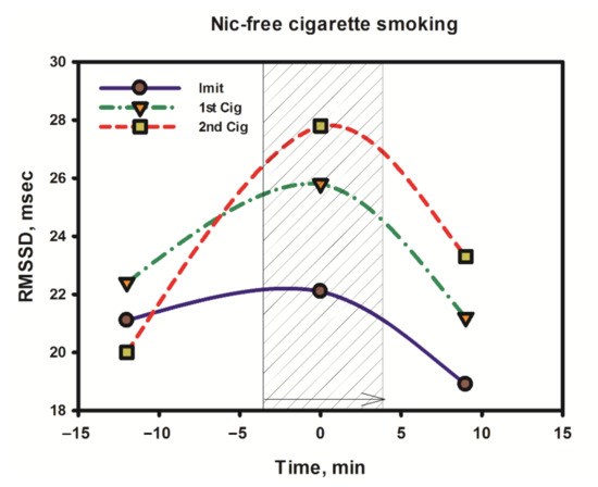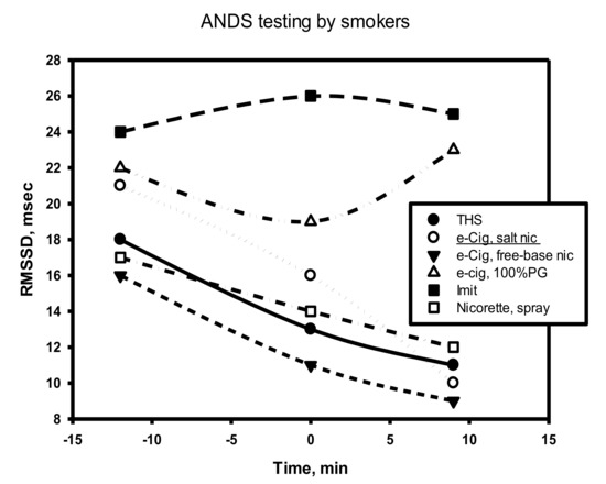It is noteworthy that, in comparison with nicotine-free smoke, nicotine products that were tested by a volunteer from among the episodic smokers (two to six cigarettes per week) exhibited a completely different and very characteristic effect on the dynamics of RMSSD in the process of the direct use of the product (Figure 9).