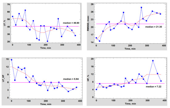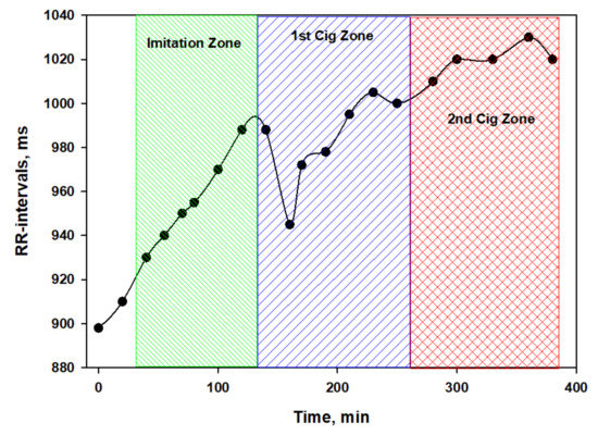 Besides, considering the duration of the experiment (more than 6 h for each subject), probably HRV indicators need to be corrected, taking into account the HR trend. The validity of this requirement is clearly seen in Figure 3, which shows the dynamics of the RR intervals of a volunteer on the day of testing a nicotine-free cigarette.