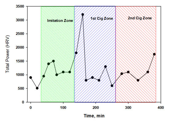 The dynamics of the total power spectrum (TP) during the testing of nicotine-free cigarettes.