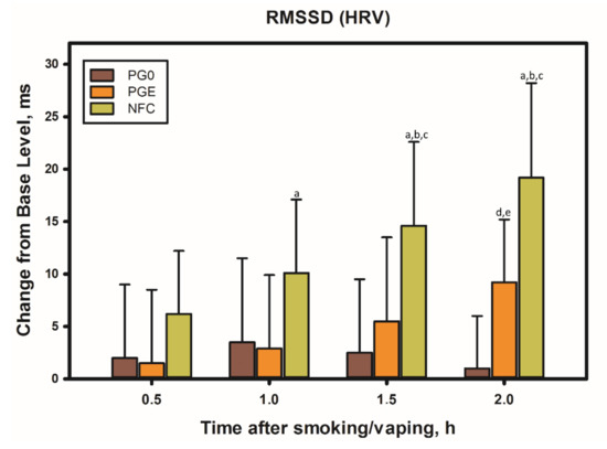 Influence of the smoke extract of the nicotine-free cigarette tar, free of the gas-phase components, on HRV in four non-smoking volunteers. PG0 refers to 25 puffs of the electronic cigarette with propylene glycol (control), and PGE pertains to 25 puffs of the electronic cigarette with the smoke extract, while NFC denotes 10 puffs of a Nirdosh nicotine-free cigarette. Designations of statistically significant differences (p < 0.05): a—relative to the baseline in the experiment with smoking (t = 0 h), b—in the experiment with smoking relative to the electronic cigarette with propylene glycol (PG0), c—in the experiment with smoking relative to the electronic cigarette with the cigarette-smoke tar extract (PGE), d—in the experiment with the electronic cigarette with the cigarette-smoke tar extract relative to the baseline (t = 0 h), e—in the experiment with the electronic cigarette with the tar extract (PGE) relative to the electronic cigarette with propylene glycol (PG0).