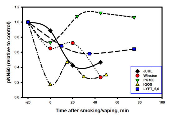 In the analysis of the influence of the tested products on ANS, two notable points were evident. Immediately after the use of the tobacco heating system (THS), the HRV decreased sharply (−80%), while immediately after using the EC with a high concentration of nicotine (JUUL), the indicator initially changed little, although the HR dynamics immediately after using both products were almost the same. The smoothest (softest) dynamics of the HRV change were recorded in the experiment with a nicotine pack. This was despite the fact that the HR remained at an increased level for the entire period of the pack fixation in the oral cavity and for at least 20 min after the pack was removed. A close relationship between the HR and HRV was maintained throughout testing the product only in the experiment with the nic-pack. It was characteristic that, for all tested products, the HRV indices were restored much later (with a 20–50-min delay) than the moment of complete recovery of the heart rate.