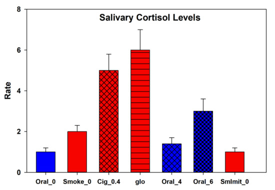 The maximum changes in the level of cortisol (relative to the baseline) in the saliva of a volunteer after testing different types of nicotine and nicotine-free products and the imitation of smoking. Experimental data acquired with oral nicotine products (packs with a nicotine content of 0.4 and 6 mg) are given in blue, while the data obtained for products with an inhalation mod for the nicotine delivery are marked in red (CC refers to a conventional cigarette with nicotine 0.4 mg, glo denotes the gloTM tobacco heating system and a nicotine-free cigarette is designated as Smoke_0, while SmImit is for the imitation of smoking with an unlit cigarette). Data are presented as means of three measurements with the standard deviation. All experiments were carried out at the same time of the day with an interval of 2 to 3 days between tests. The experiment involved a volunteer from the group of rare smokers (2–4 cigarettes per week with a nicotine content of 0.4 mg).