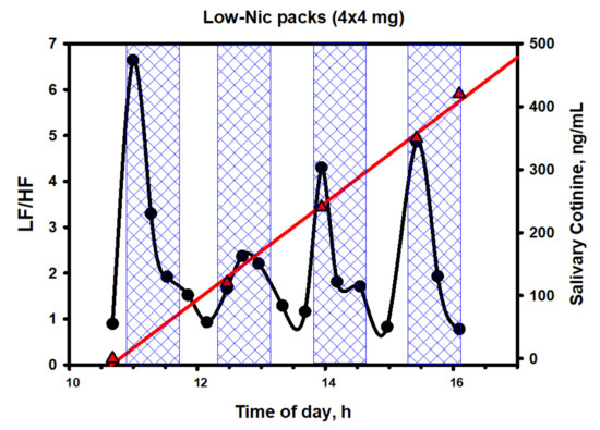 Figure 11 shows the dynamics of cotinine in saliva and that of the LF/HF ratio, while Figure 12 depicts the dynamics of salivary nicotine.