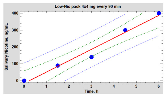 Dynamics of nicotine in saliva (collection of saliva every 45 min immediately before using the next pack). Regression line (red) p = 0.0018. 95% confidence level (green dots).