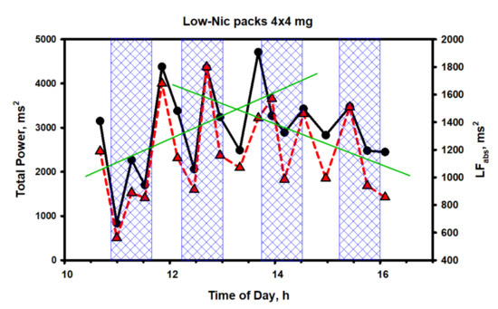 As it is seen from Figure 13, the fluctuations of the two spectrum indicators characterizing the general and sympathetic activity of the ANS also occurred in a very wide range of values, without any reference to the concentration of nicotine in the body. This was particularly noticeable at the initial stage of testing (the first pack and the first shaded area), when nicotine, in fact, had not even entered the bloodstream or was present in ultra-low concentrations, but HRV, closely related to the total spectrum power and ANS activity, decreased to abnormally low values due to activation of the central regulatory mechanisms. Then, an even more interesting feature was observed. The trends of both indicators grew simultaneously during the entire first half of the test (the first and the second packs); after which, they sharply changed direction to the opposite one. Evidently, having experienced initial stress from irritation of the gums at the place of fixing the pack or for some other reason, the body gradually adapted to the new and unusual form of nicotine consumption.