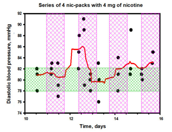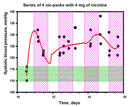 For the study, we chose nic-packs with a nicotine content of 4 mg (analog of Nicorette chewing gum with 4 mg of nicotine). A volunteer, a former smoker, agreed to take part in the experiment that involved the use of four packs in 6 h, according to the 45-min scheme, fixing a pack in the oral cavity between the upper gum and lip with a 45-min recovery (without a pack). Before the start of the experiment, during it and at its end, venous blood and saliva were taken to control the level of cotinine and nicotine, as well as other biomarkers. During the experiment, the blood pressure, blood sugar levels and the concentrations of nicotine and cotinine in the saliva were monitored continuously, and an electrocardiogram was taken at 6–8-min intervals for the subsequent HRV analysis. During the experiment, the subject did not have meals, and only drinking pure water no more than three times (150 mL each) was permitted.