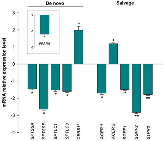 Differential expression of genes involved in sphingolipid metabolism grouped according to their metabolic pathways that converge upon ceramide: de novo and salvage pathways. The values from the controls (n = 10) were set to 1. Data are presented as the fold change ± standard error. Heart failure patients (n = 26; green bars). Mann–Whitney U test: * p < 0.05, ** p < 0.01 vs. control group. # This enzyme acts both in the de novo biosynthesis and in the salvage pathway (Table S1). PPARA is a key regulator of lipid metabolism through the de novo ceramide pathway (transcription factor).