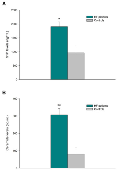 In recent years, the role of ceramide and sphingosine-1-phosphate (S1P) in the physiology and pathophysiology of the heart has attracted significant attention. The accumulation of specific ceramides in the ischemic myocardium that is further elevated upon subsequent reperfusion has been observed, indicating that ceramide may be involved in the induction of cardiomyocyte apoptosis by ischemia/reperfusion injury [3,4]. Similarly, the accumulation of lipids within the myocardium with non-ischemic heart failure (HF) occurs, and although the mechanism is unclear, it seems that the accumulation of ceramide plays a key role in this phenomenon [5,6] via the activation of programmed cell death [7] or its effect on myocardial glucose and fatty acid metabolism [6].