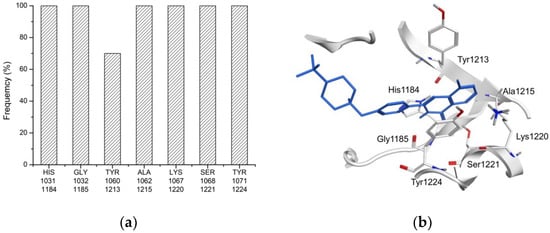 The calculation of MM/PBSA binding free energy from the minimized structures could result in a satisfactory correlation coefficient between affinity and binding free energy [26,27]. Therefore, the binding energy of compounds was calculated and ranked with the “Calculate Binding Energies” module in DS2018. The results indicated that the hit rate of the TNKS inhibitors was 25.4% in the top 5% compounds of all the ranking compounds, meaning that the hit rate when calculating binding energy is more accurate than that obtained through pharmacophore docking only. Moreover, studies have also demonstrated that the combination of docking scores and residue interactions can increase the VS hit rate [15,28]. Hence, we combined the binding energy and critical residues methods to rank the compounds by their weighted binding energy scores (Figure 3 and Table 2). The hit rate of the TNKS inhibitors increased to 26.98% in compounds ranking in the top 5%. The hit rate of the weighted binding energy was more accurate than that of the DS2018 binding energy calculations in this study.