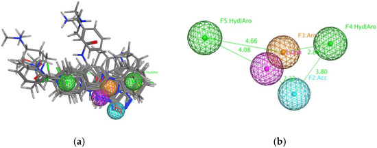 The defined pharmacophore model of TNKS protein. (a) 10 crystal structures and co-crystal ligands were superposed. (b) The purple is F1 donor, the cyan is F2 acceptor, the orange is F3 aromatic, and the two greens are F4 and F5 aromatic or hydrophobic. The F2 and F3 are defined as essential ligand features.