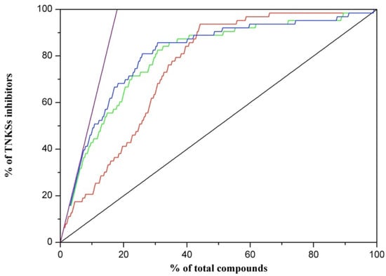 The combination of docking and a pharmacophore-based search was recommended to increase the hit rate, compared with using only one approach [25]. The 50 TNKS-1 inhibitors, 50 TNKS-2 inhibitors with an IC50 value of less than 2 μM, 160 FDA-approved compounds, and 937 ChEMBL compounds that were hit in the pharmacophore search were then selected for pharmacophore docking. The results indicated that 33 TNKS-1, 30 TNKS-2 inhibitors, 29 FDA-approved compounds, and 259 ChEMBL compounds were hit. We ranked these compounds on the basis of their docking scores, and we analyzed the true positive hit rates, as presented in Figure 3 and Table 2. The pharmacophore docking indicated that 17.46% of the TNKS inhibitors were present in the top 5% of the ranked compounds, the random ranking was 5.13%, and the ideal ranking was 28.57%. We redocked the cocrystal ligands of the TNKSs to illustrate that except for 3UH2 with a high RMSD value of 3.39 Å and 4BJC, for which the pharmacophore docking could not fit the pharmacophore, the cocrystal structures had low RMSD values (Figure S2). The hit rate of the TNKS inhibitors for pharmacophore docking based on docking scores was more accurate than random ranking to illustrate that the cocrystal ligands of TNKSs have low RMSD values.