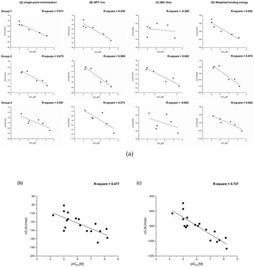 The relationships between the experimental pIC50 of TNKS-1 inhibitors and binding free energy (kJ/mol) calculations (a) column A from single-point minimization; column B from NPT-based simulation; column C from MD-based simulation; column D from weighted binding energy calculation. (b,c) The relationship of all experimental pIC50 of TNKS-1 inhibitors and binding free energy. (b) from single-point minimization (c) from weighted binding energy calculation.